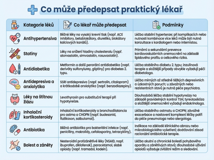 Role praktického lékaře se v posledních letech posunula. Už dávno neplatí, že slouží jen jako „přestupní stanice“ ke specialistům. Díky změnám pravidel může váš praktický lékař řadu potíží vyřešit rovnou –včetně předepsání léků, které dříve patřily výhradně do rukou odborníků.